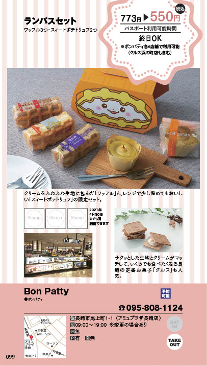 【ランチパスポート長崎Vol.9】ランパスセット〈Bon Patty〉 ランチパスポートvol.9_おやつ 〈Bon Patty〉 ランパスセット 773円550円 ランチパスポートVol.9を買うと こちらのメニューを割引価格で食べられる! なんと、掲載メニューをぜんぶご紹介中! 詳しくはこちら! ランチパスポートVol.9 ※この画面を提示、または印刷して提示しても割引は適用されません。 関連記事