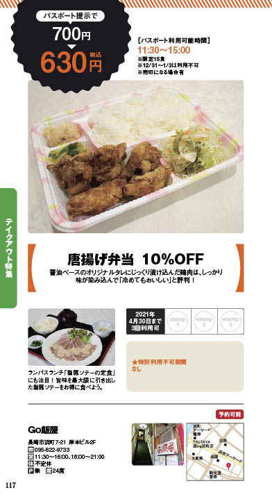 【ランチパスポート長崎Vol.9】唐揚げ弁当 10%OFF〈Go飯屋〉 ランチパスポートvol.9_テイクアウト 〈Go飯屋〉 唐揚げ弁当 10%OFF 700円630円 ランチパスポートVol.9を買うと こちらのメニューを割引価格で食べられる! なんと、掲載メニューをぜんぶご紹介中! 詳しくはこちら! ランチパスポートVol.9 ※この画面を提示、または印刷して提示しても割引は適用されません。 関連記事