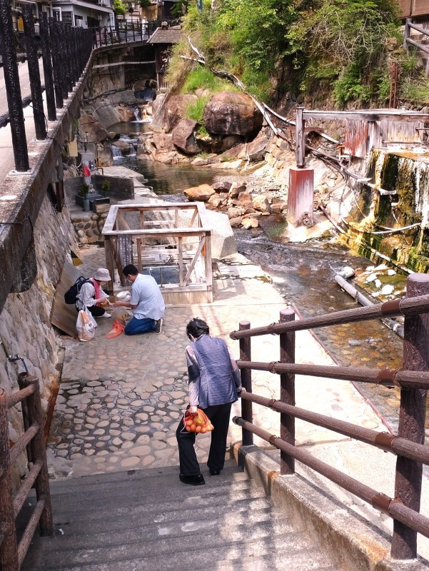 ここでプチ情報。つぼ湯近くの川沿いには常に源泉が湧いている湯筒があり、周辺の土産物屋さんで卵や野菜を購入し、茹でて楽しむことができます。