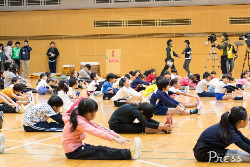 内村選手の動きに合わせて子どもたちも一緒に運動します。180度開脚はさすがにマネできません😅