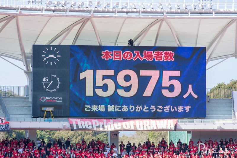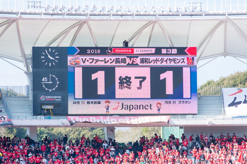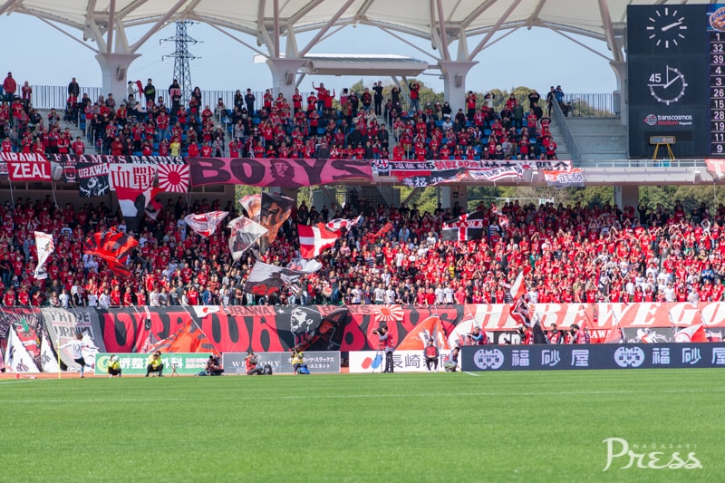 浦和レッズは熱狂的なサポーターでも有名ですが、アウェイ側は赤一色。埼玉と長崎の距離を感じないくらいの威圧感がありました。