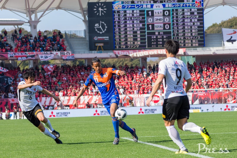 そして、浦和の守備の要といえば槙野選手。強靭な肉体とメンタル、1対1での強さ、そして危険なエリアを瞬時に察知してのディフェンスで、幾度となく長崎のチャンスが阻まれました。