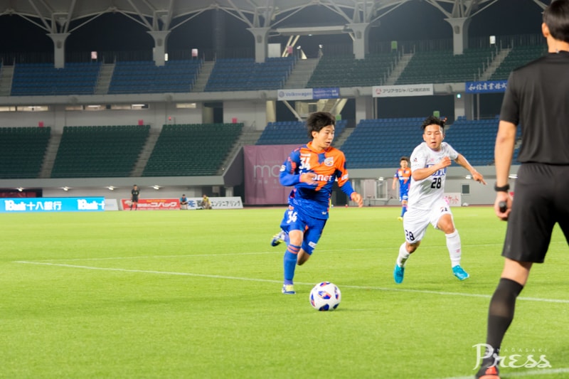 後半31分、スルーパスに抜け出した木村選手が左サイドからペネルティーエリアに進入、ディフェンダーとうまく体を入れ替え、バランスを崩しながらも鋭いクロス。