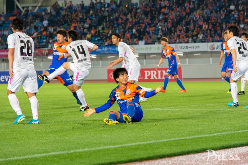 なんとか同点に追いつきたい長崎。その2分後、名倉選手が持ち前の鋭いドリブルから右サイドを切れ込み、ペナルティーエリア内でディフェンダーと交錯して倒れます。