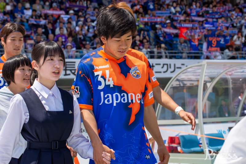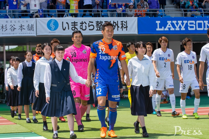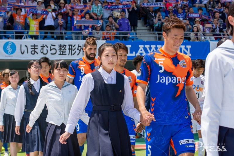 そして選手入場。今回のエスコートは、核兵器廃絶を求めて署名活動を行っている高校生平和大使。平和祈念マッチに華を添えます✨