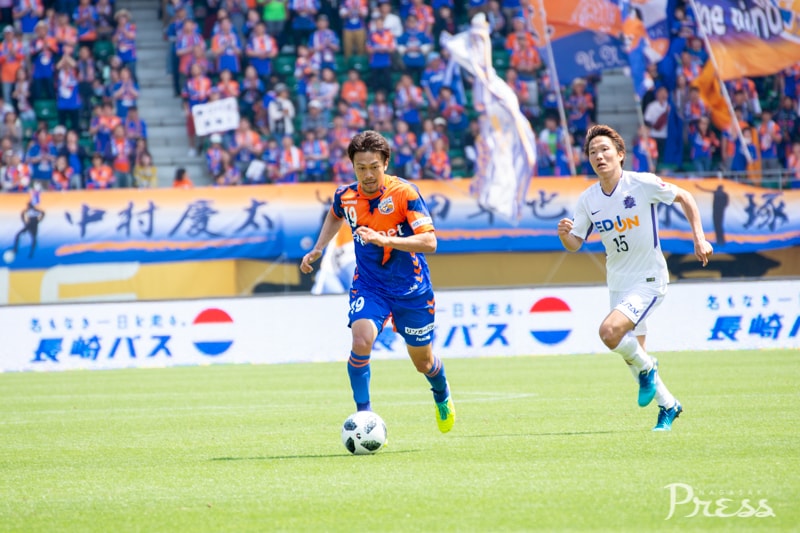 同点に追いつきたい長崎はすぐさま交代のカードを切り、名倉選手を下げて中村慶太選手を投入。攻撃にリズムが生まれ始めます。