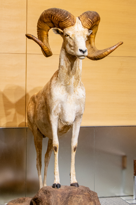 野生ヒツジの王様と呼ばれる「アルガリ」の剥製標本。