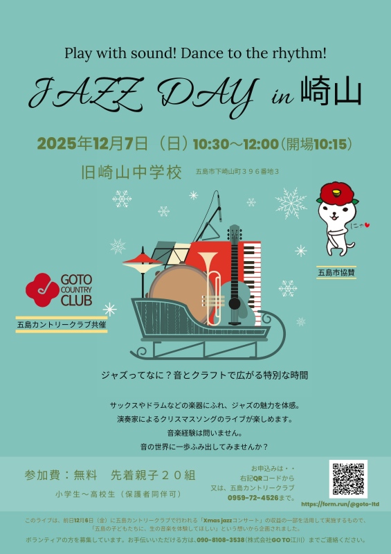 「五島の子どもたちに生の音楽を体験してほしい」という想いから企画されたこのイベントは、前夜12月6日(土)に五島カントリークラブで行われる「Xmas Jazzコンサート」の収益の一部を活用して実施される。