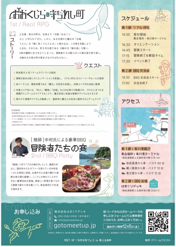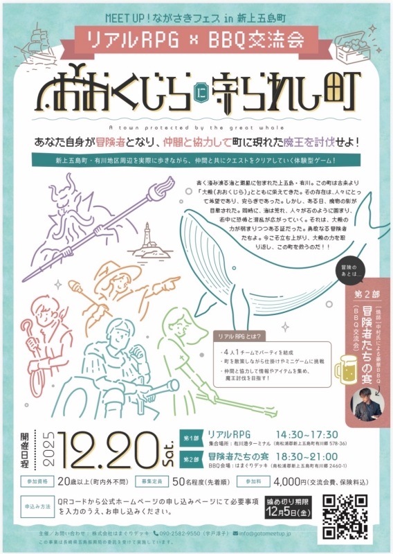 2025年12月20日(土)に開催される、リアルRPG×BBQ交流会「おおくじらに守られし町」は、新上五島町・有川地区を歩きながら物語の世界を体験できるイベント。