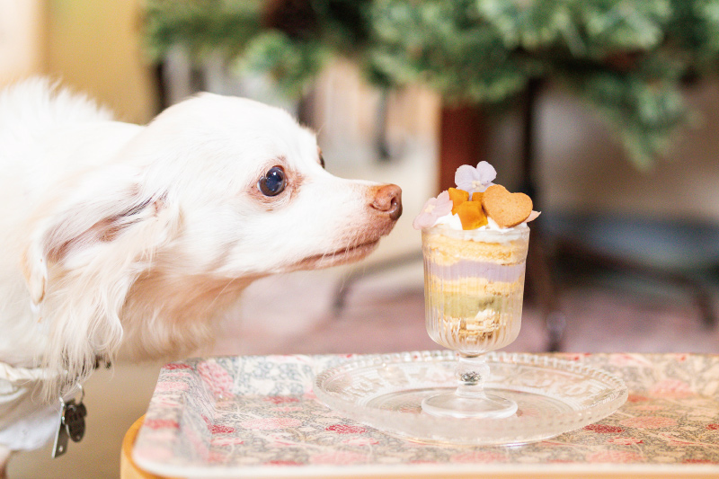 ワンちゃんの形のメレンゲクッキーが乗った「ジェラートパフェ」1,250円。