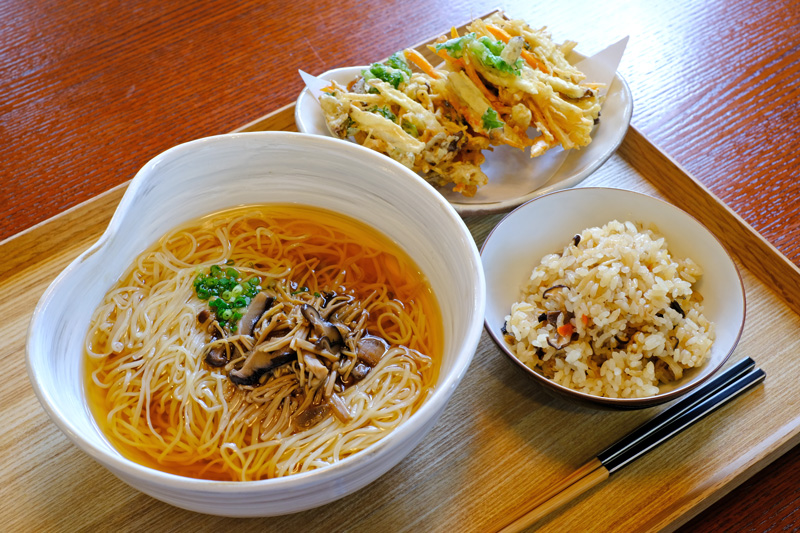 大人気の“養々麺”が美味しいのはもちろん、3種のきのこと地元食材をたっぷり使用した“かき揚げ”は、シャキシャキとしたきのこの歯ごたえと、衣のカリッとした食感がたまらない。