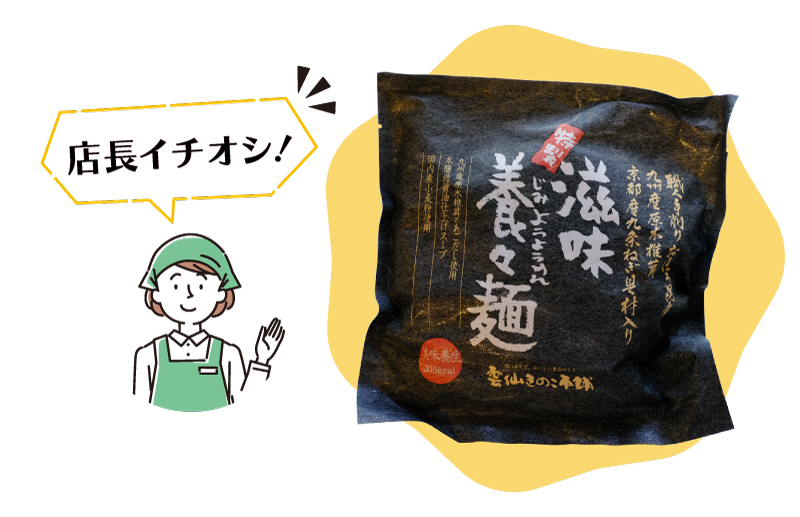 「雲仙きのこ本舗」と聞けば言わずと知れた看板商品 “養々麺(ようようめん)” を出来立てで味わうことができます。