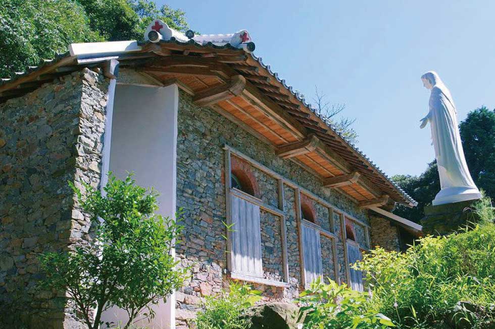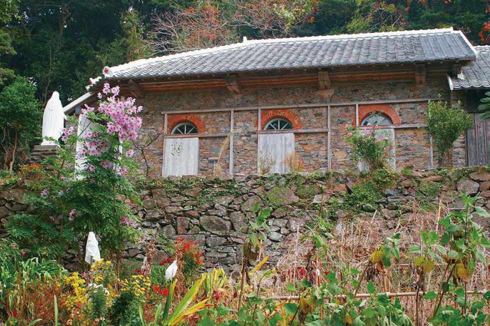 出津教会堂から北西へ、車で10分ほど走る場所に位置するのが「大野教会堂」。出津教会の巡回教会としてド・ロ神父が設計・施工、1893年に完成したものです。出津教会堂とはまたひと味違い、より質実剛健な設え。現地の自然石を積み上げた外壁は、ド・ロ神父の建築技法を駆使した、いわゆる「ド・ロ壁」と呼ばれるもの。この地方の伝統的な民家建築の工法をベースとしながら、ド・ロさま指導による西洋的建築技術も垣間見ることができる、素朴ながら歴史的重要度の高い建物。