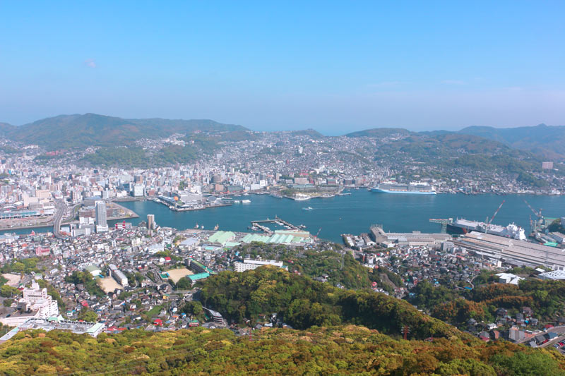 『鶴の港』とも呼ばれる長崎港を中心に周囲が山で取り囲まれ、すり鉢状の地形を成している、長崎のまち並みが見下ろせるのです。