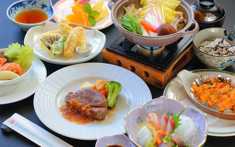 夜には、水平線に浮かぶ漁火の幻想的な景色も楽しめますよ!自然に抱かれた対馬ならではの食材を贅沢に使った、ホテルメイドの料理も◎。四季折々の山海の幸、郷土料理の味わいを十分に堪能させてくれます。対馬ではなかなかお目にかかれない温泉にも浸って、心も体もどっぷりと癒やされて。