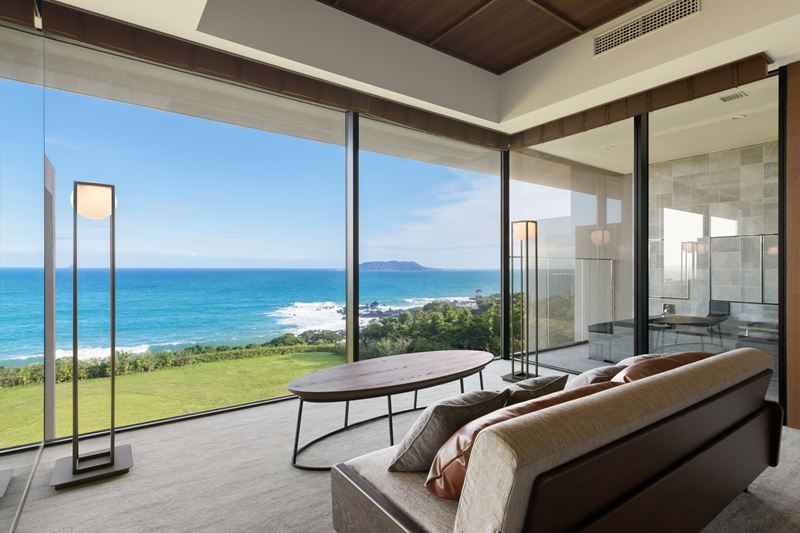 朝は朝日を、昼は広大な水平線を、夜はロマンティックな漁火を見ることができる、対馬のリゾートホテル。館内の至る所から海を一望することができます。開放感たっぷりのテラスは、潮の香りを感じる心地よい風が通り、スイートルームからも雄大な海を望むことができるのだとか。