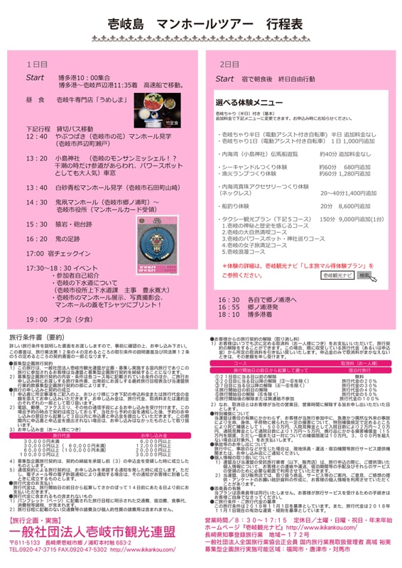 ●壱岐島マンホールツアーに関するお問い合わせ 一般社団法人壱岐市観光連盟 担当:高城(たかじょう)・徳永 Tel:0920-47-3715 Email:travel@ikikankou.com