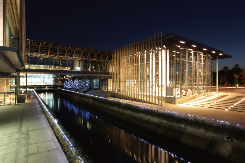 ライトアップされた美術館と中心を流れる運河沿いのイルミネーションが幻想的な空間を醸し出す。