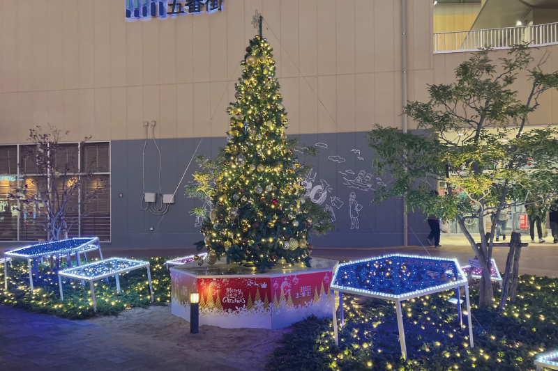 玄関口のイルミネーションツリーや、館内には華やかなクリスマス装飾を各フロアに設置。