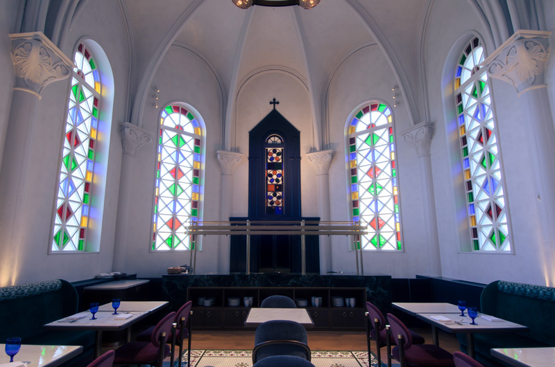 ステンドグラスを背景にしたレストランの様子は、それだけで写真に残したくなるような美しさで、ティーセットと一緒に写せば、クリスマスのお出かけの一枚になります。