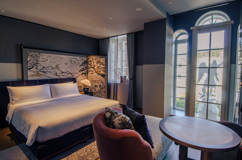 ツアーの途中では、客室の一室を覗けることもあります。クローゼットには唐紙の柄などがさりげなく使われていて、⾧崎らしい「和」と「洋」が溶け合う空気が流れています。お部屋によっては、大天使ミカエル像の背中を間近に望める印象的な客室に出会えることも。滞在はしませんが、「ここでゆっくり過ごしてみたい」と感じる静かな空間です。
