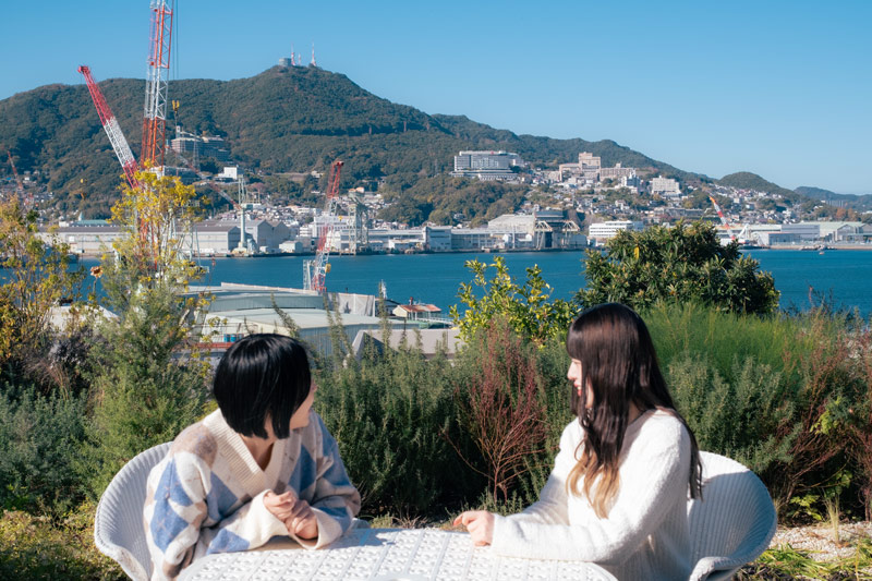 テーブル席を備えたテラスに出て、景色を楽しむひとときもあります。⾧崎港に出入りする船やクレーン、その向こうの山並みまで見渡せて、ふと反対側を見ると、レンガ造りのホテルの外観も間近に眺められます。港の気配や街の息づかいを感じながら、⾧崎の港町らしさに触れることのできる場所です。