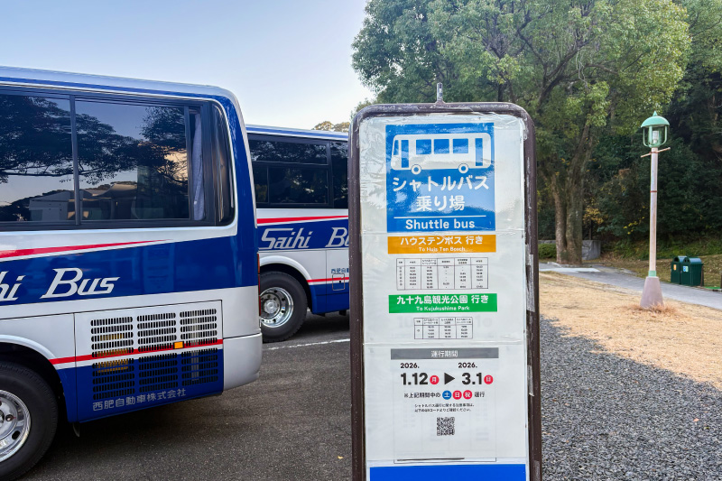 令和8年1月12日(月・祝)〜令和8年3月1日(日)までの期間、ハウステンボスと九十九島パールシーリゾートを結ぶ無料シャトルバスの、運行コースと乗降場所が追加されます。