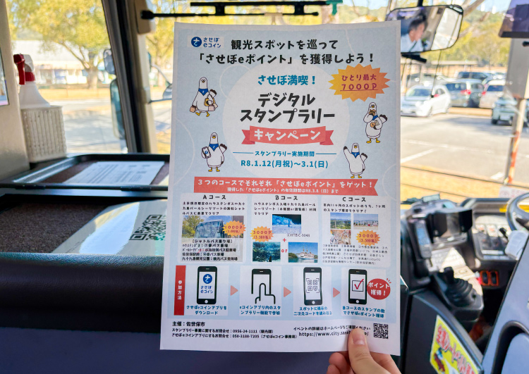 シャトルバスに乗車して、車内に設置されている二次元コードを読み取ると「させぼeポイント」1,000ポイントを獲得!獲得したポイントは、させぼeコインの加盟店舗で利用できるそう。
