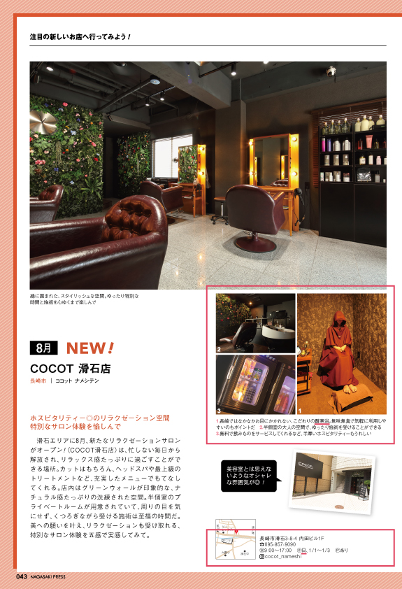 【お詫びと訂正】ながさきプレス2025年10月号について プレスリリース ながさきプレス本誌10月号にて誤りがございました。 〇P043 NEW OPEN「COCOT 滑石店」さまの記事において以下の誤りがございました。 【誤】 ①キャプション:1.長崎ではなかなかお目にかかれない、こだわりの酵素浴。 ②定休日:日 ↓ 【正】 ①キャプション:1.長崎ではなかなかお目にかかれない、こだわりの酵素蒸し。 ②定休日:月 関係者の皆様並びに、読者の皆様にご迷惑をおかけしましたことを、深くお詫び申し上げます。 関連記事