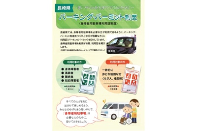 医療・福祉-トピックス長崎県パーキング・パーミット制度を知っていますか? パーキング・パーミットとは、公共施設やショッピングセンターなどの身障者用駐車場の適正利用のため、歩行困難な人に対して交付する県内共通の身障者用駐車場利用証のこと。利用できる人は、身体の障害や高齢、難病で歩行が困難な人、または一時的に(ケガや妊産婦など)歩行が困難な人だ。...