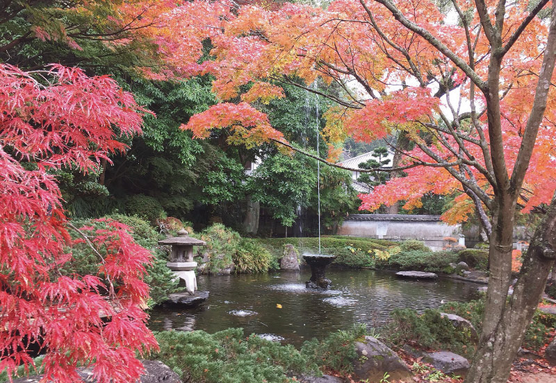 こちらの見どころは、鮮やかな庭園の紅葉が逆さまに映し出される「逆さ紅葉」です。