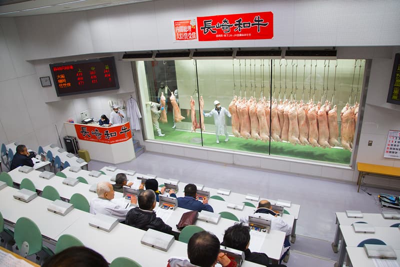 長崎和牛の魅力をもっと知ってもらおうと〈長崎和牛ブランド県北協議会〉が企画したプレスツアーに編集部が参加!当日は長崎はもちろん福岡など県外のマスコミも多く来佐した。最初に訪れたのは〈ホテルオークラJRハウステンボス〉最上階の〈鉄板焼大村湾〉。非日常的な空間と、目の前で焼かれるお肉に、参加者一同の顔も思わずほころぶ。特別な料理を堪能した後は、〈佐世保食肉センター〉へ。当日は月例会のため、県内の生産者たちが育てた長崎和牛が多く出品。普段は見ることのない、セリの現場を体験できた。